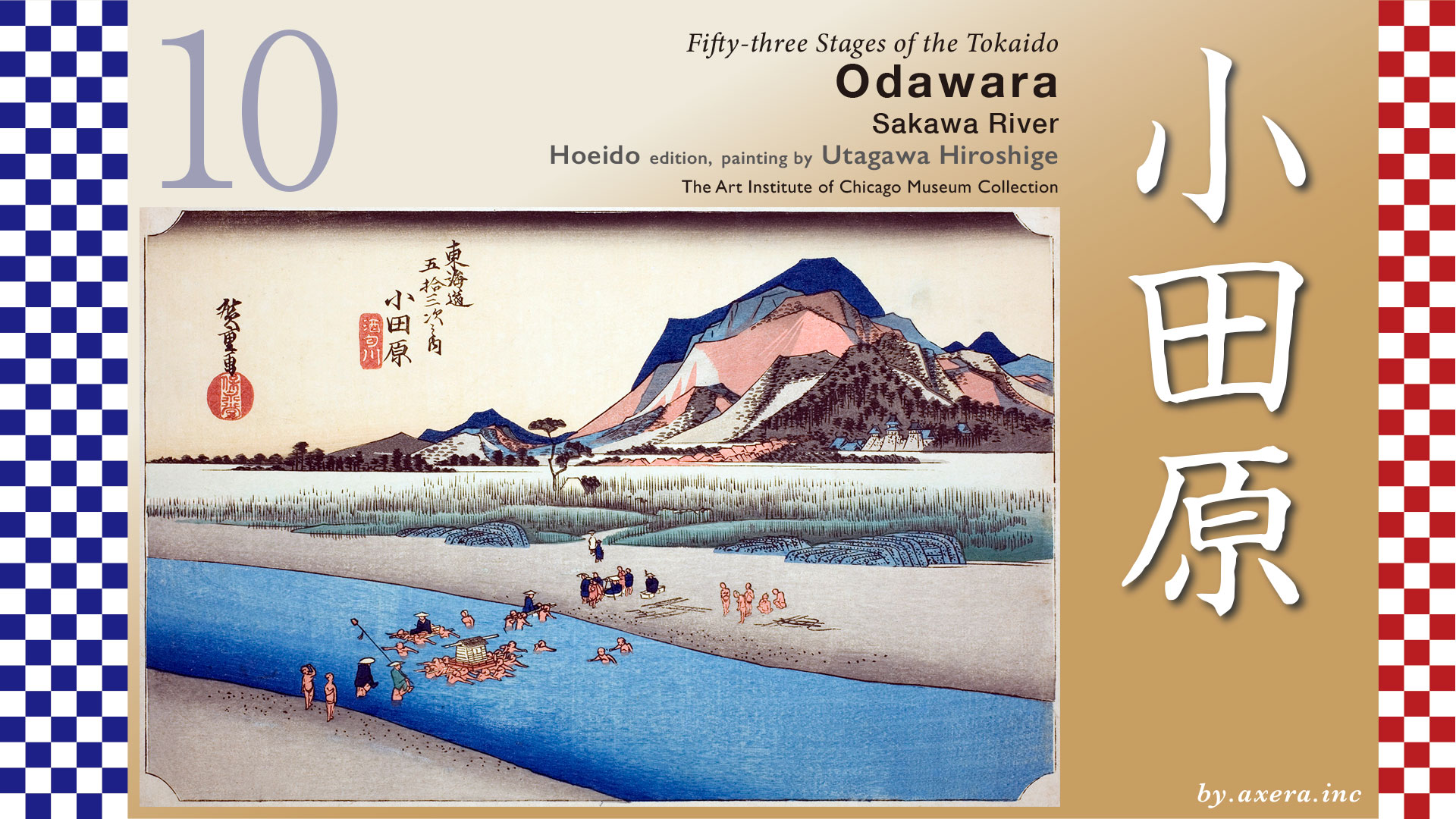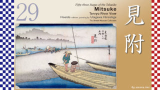 If you look closely, you can see various scenes from across the river on the other side, including a scattered wheeled palanquin stand and naked people waiting for customers. The material depicted at the far end of the riverbank is a “snake basket,” which is used to protect the riverbank when the water level rises. Beyond the reeds growing on the riverbank is Odawara juku, and to its right, the blue roof depicts Odawara Castle.