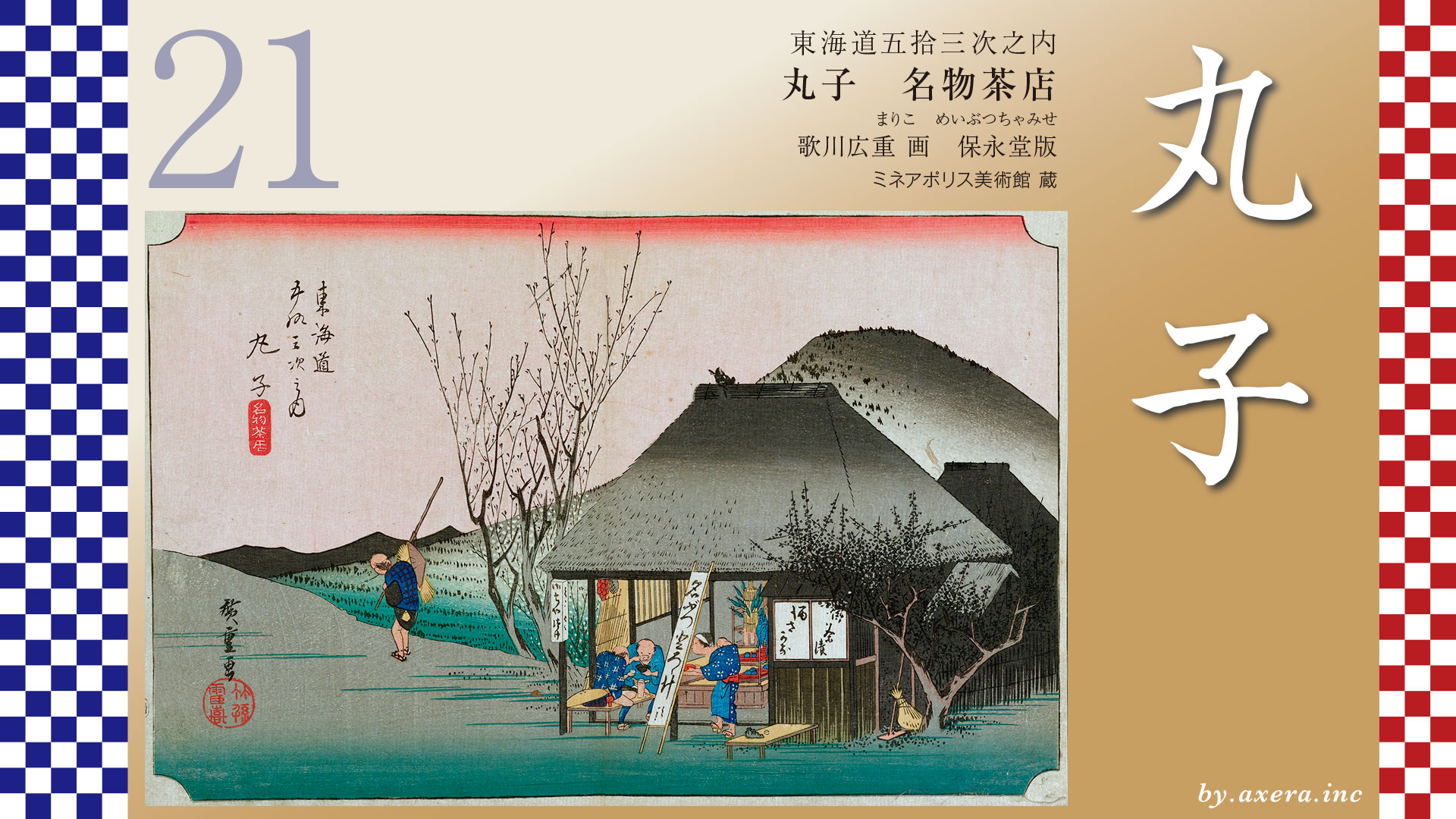 The Gyosho edition depicts a tea store making Abegkawa mochi, a specialty of Abekawa, and travelers coming and going in front of the shop. Judging from the travelers’ attire, they seem to be on a pilgrimage to Ise.