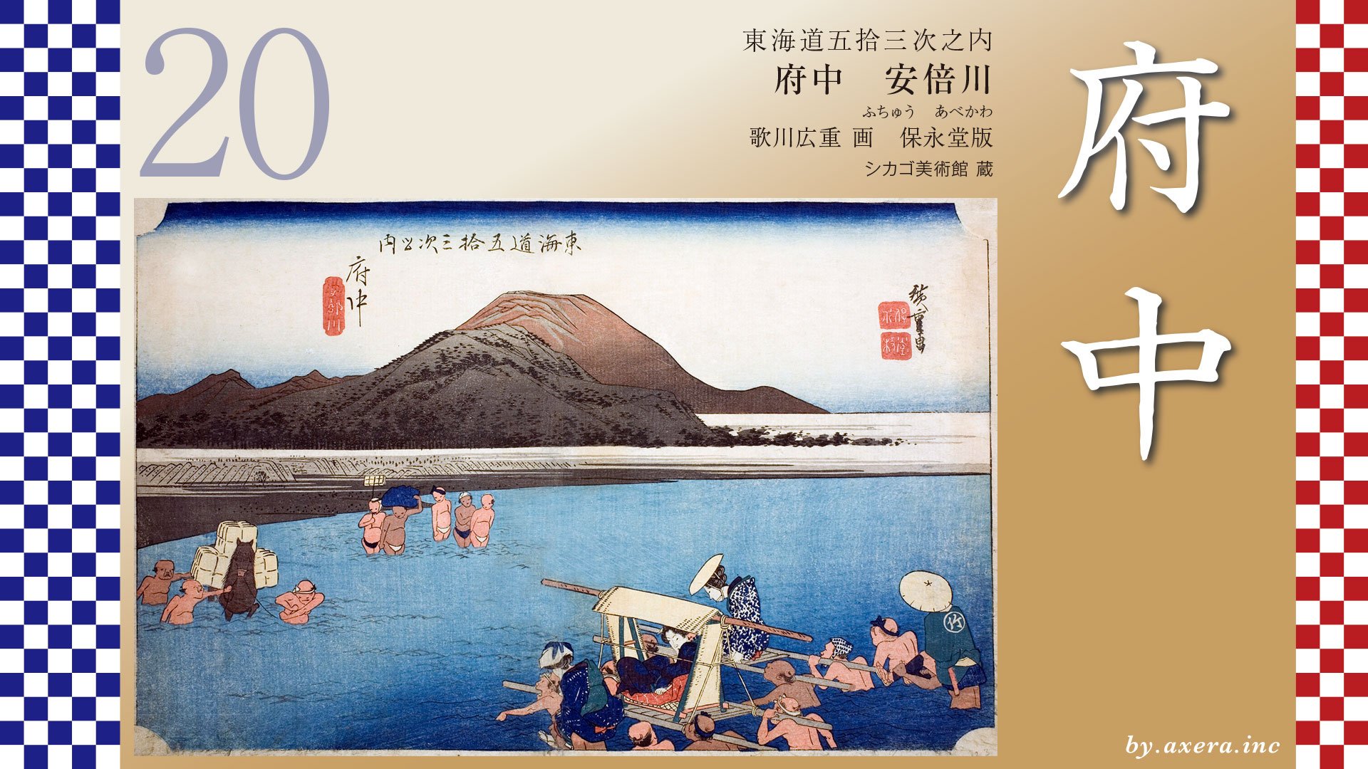 This painting, while called Fuchu, is subtitled Abekawa, or Abekawa River, and thus depicts a river crossing on the Abekawa River. The shape of the mountains in the background indicates that this painting is looking at the Abekawa River from the east.