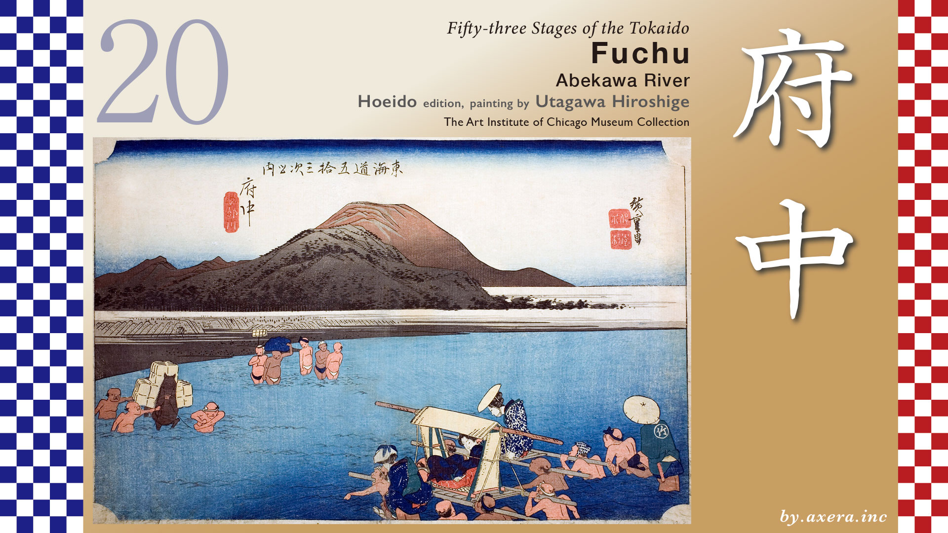 This painting, while called Fuchu, is subtitled Abekawa, or Abekawa River, and thus depicts a river crossing on the Abekawa River. The shape of the mountains in the background indicates that this painting is looking at the Abekawa River from the east.