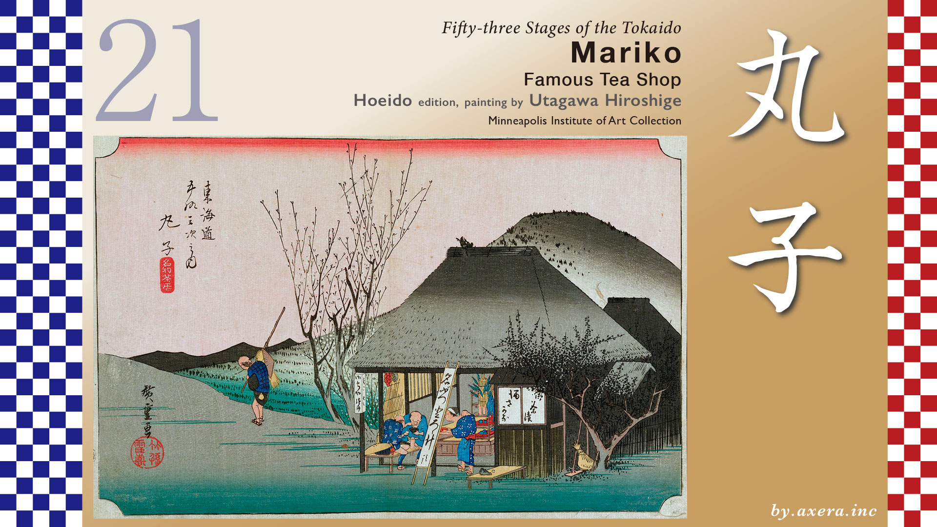 Mariko-juku, the smallest relay station on The Tokaido, had several teahouses at the time, and Hiroshige painted Mariko as one of the “famous teashop”.