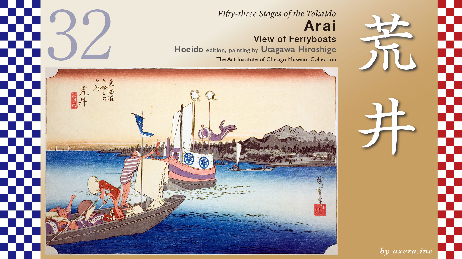 また、広重がこの画を描いた天保の頃の記録では、船賃は、人一人18文、荷物一駄53文となっていました。現在の職人価格換算では一文を50円として、一人約900円ですね。広重の視点に赤いグラデーションを入れてみました。
