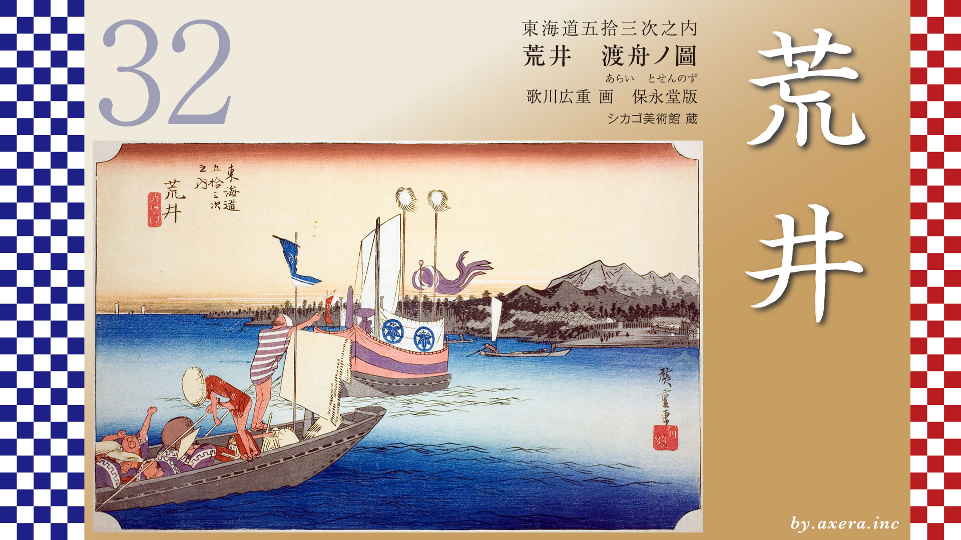 広重は、そんな人気のなかった荒井関所を右の遠景に置き、二艘の船を描いています。