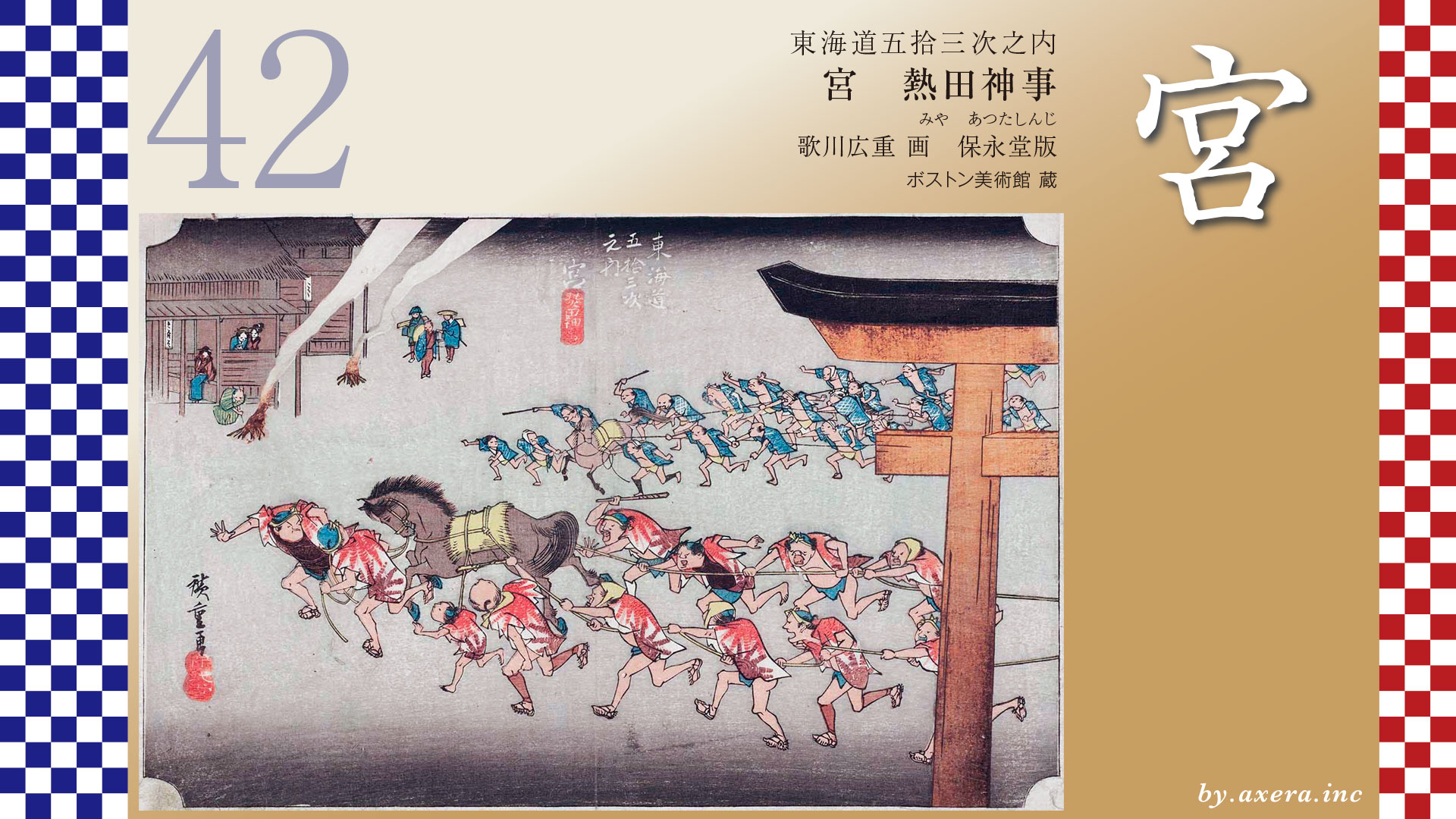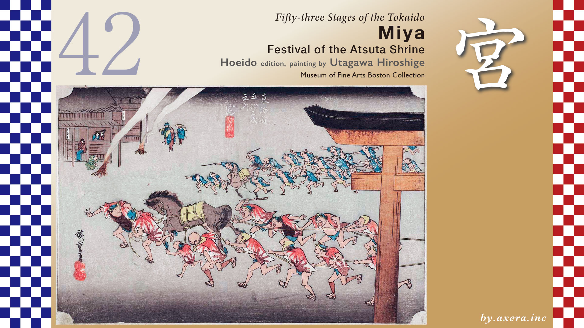 黄色い丸は本陣の位置を示していますが、この一帯は熱田神宮の門前町であり、伊勢参りの旅人が集う一大拠点でした。宮宿は天保14年、1843年には、本陣・脇本陣・旅籠合わせて250軒、家数3000軒、人口1万人超という、東海道随一の規模を誇っていたのです。