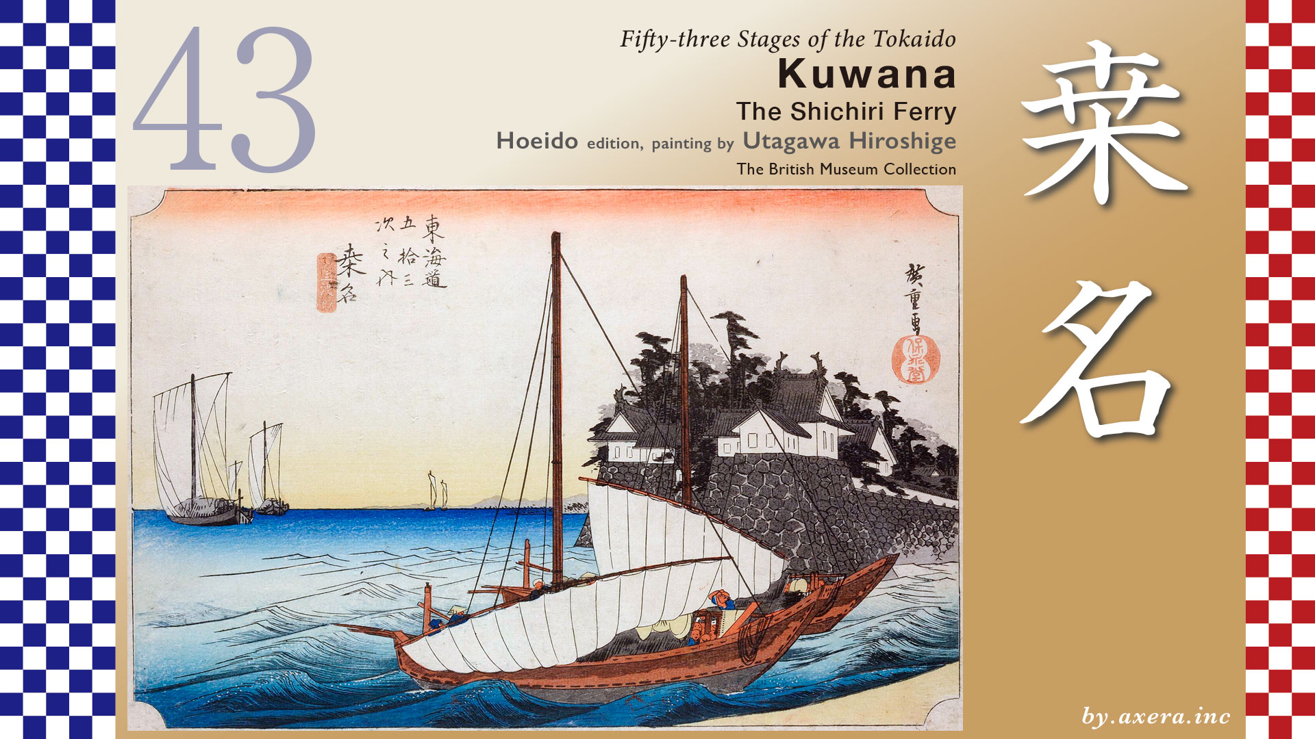 遠景には、四日市宿の屋根と、港に停泊する弁才船の帆。かつてこの海は那古浦と呼ばれ、蜃気楼の名所としても知られていました。そこには、蛤の出す気の中を、熱田神宮や伊勢の神々が行き交うという、幻想的な信仰も重なっていました。