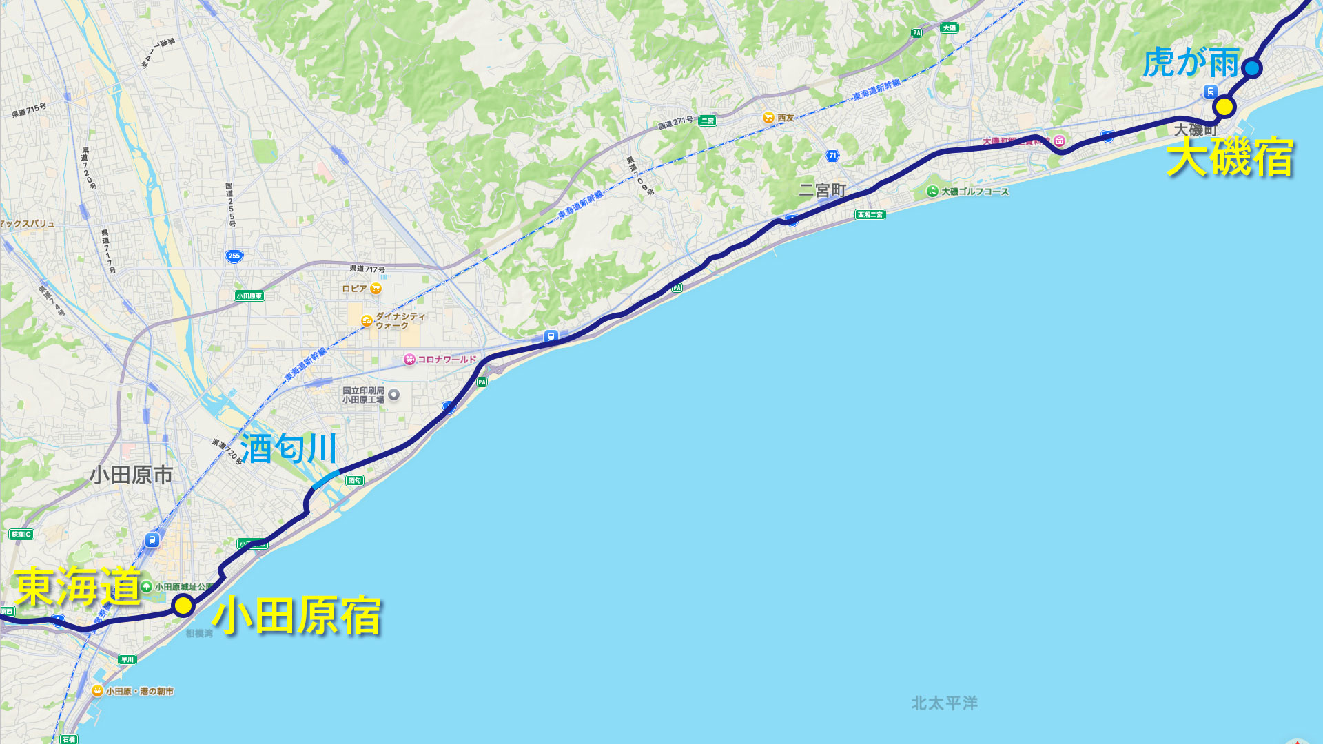 当時の東海道の位置をご理解いただくため、Apple MAPを使って江戸時代の東海道を紺色で被せています。作った地図の中に出てくる、黄色い丸には、基本的に宿名が記載されていますが、これは本陣の場所です。また解説に出てくる、宿間の距離はこの本陣間の距離でもあります。また、地図の中の青い丸は廣重が描いた場所を表しており、基本的に廣重の画の副題が記されています。