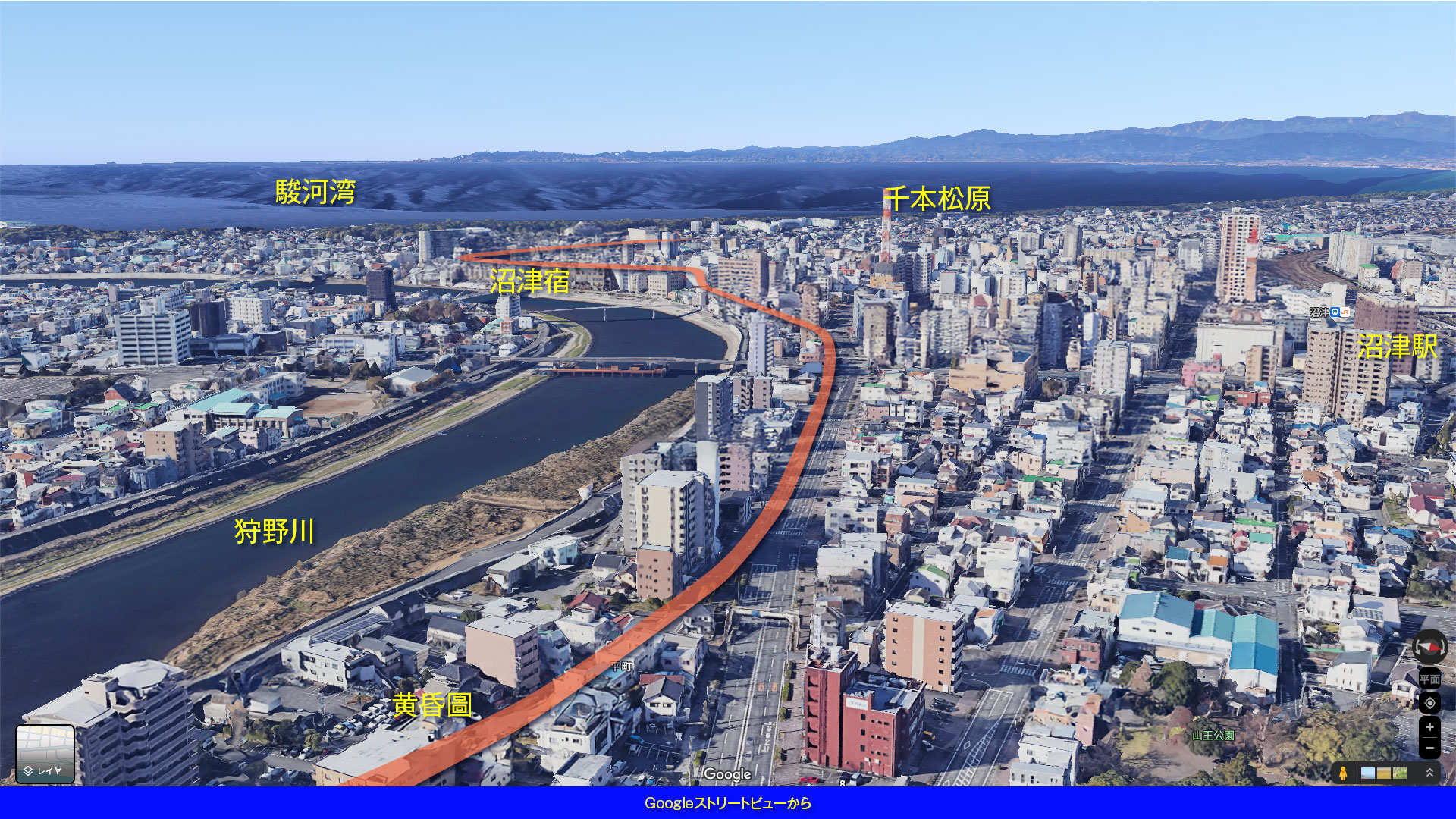各宿の最後に、進行方向に向かって上空から見たGoogleMAPのストリートビューを掲載しています。東海道を上から眺めている感じですね。これにより、現在の景色と東海道を一緒に見た感覚になるようにしています。ただし、当時と地形や道路形状が違っているので、東海道が道路ではない場所を通っていることがあります。