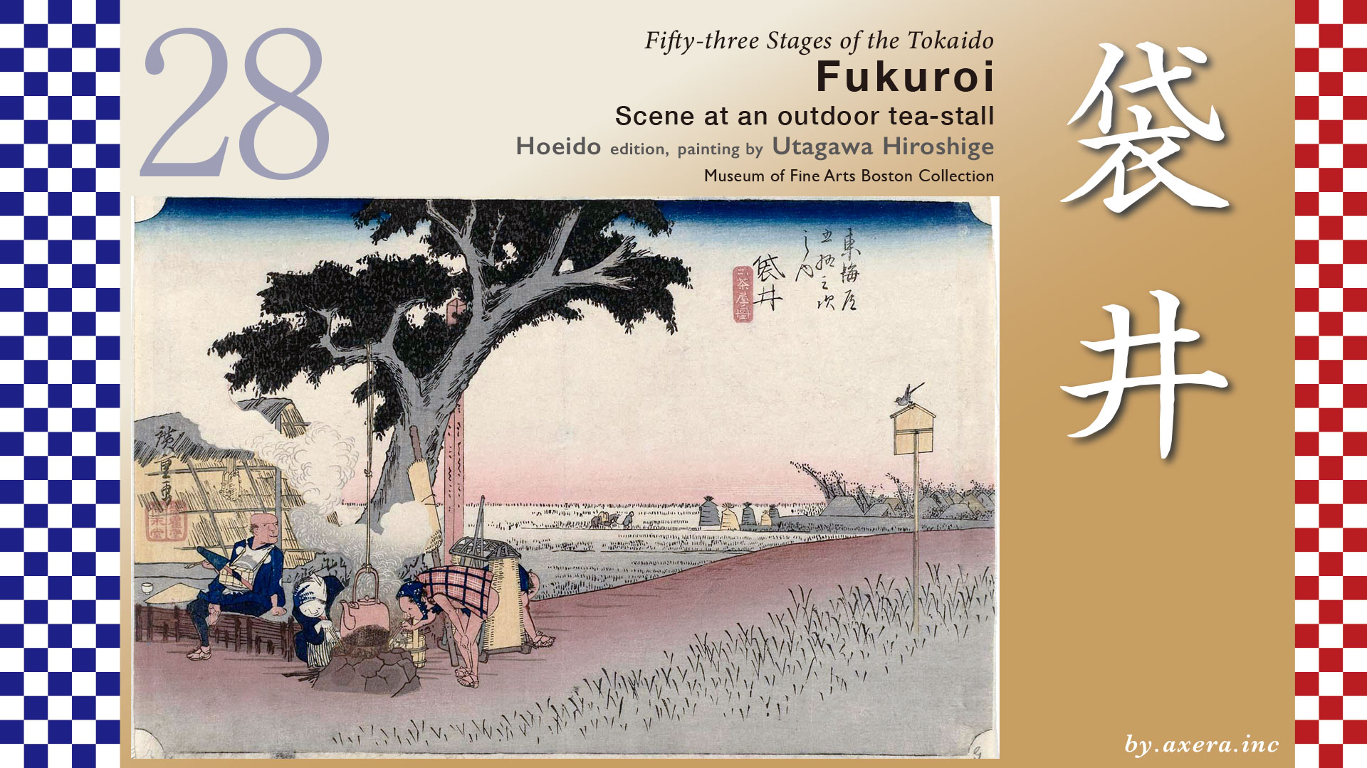 広重は、江戸から来てこの袋井宿に入る手前の、天橋あたりにあった、茶屋を描きました。副題の「出茶屋」は葦簀などを使った簡易な作りの茶屋のことで、道端で旅人が休憩できる憩いの場でした。広重は、そののんびりした空気をゆったりとと、描いています。